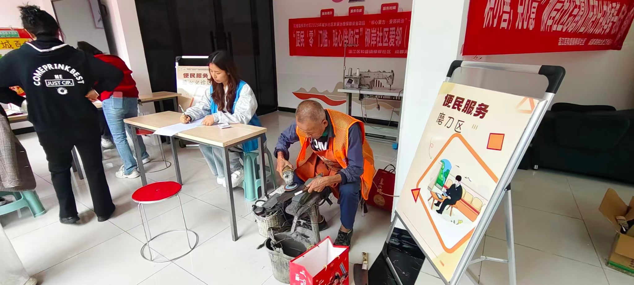 活动筹备阶段,志愿者们提前到场,协助工作人员细致完成工具清点、场地布置与流程规划工作,不仅将理发围布、剪刀分类摆放整齐,还为磨刀区域划定安全等候线,并协助医护人员搭建义诊登记台,用全面且周到的准备为活动开展筑牢基础。活动开展过程中,志愿者们分工明确又主动补位,在理发区引导居民有序排队理发,在磨刀点协助居民登记刀具信息并提醒等候居民注意安全,在义诊区全程陪同老年居民,协助完成信息填写与血压测量,有效缓解了现场工作人员压力,保障各项服务高效运转。