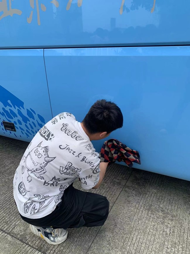 在队长陈郅昂的带领下,同学们带上各自的清洁工具投入到校车清洗活动中。从车厢内的每一排座椅、每一扇车窗玻璃、每一根扶手,到车外的车身、轮胎、挡风玻璃,同学们都悉心清理,用心擦拭。尽管当天天气仍有些清冷,但劳动后的大家心里确实是暖洋洋的,大家都期盼着老师们坐上干净、清新的校车后的愉悦心情。