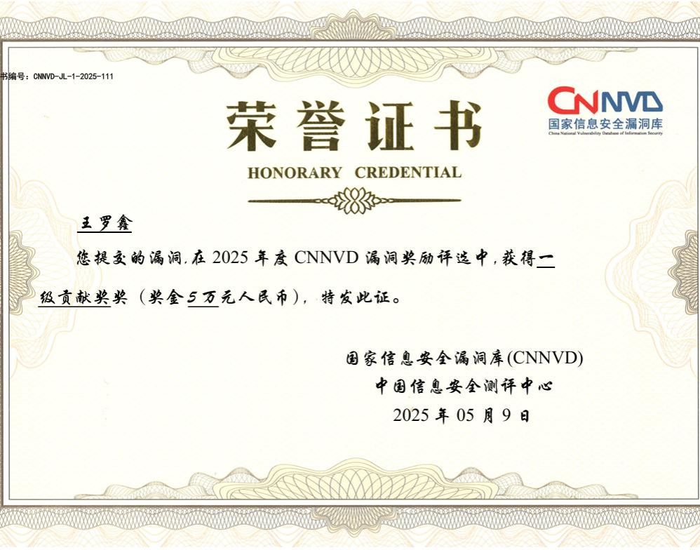 万象城学子在2025年CNNVD漏洞奖励评选中荣获一级贡献奖