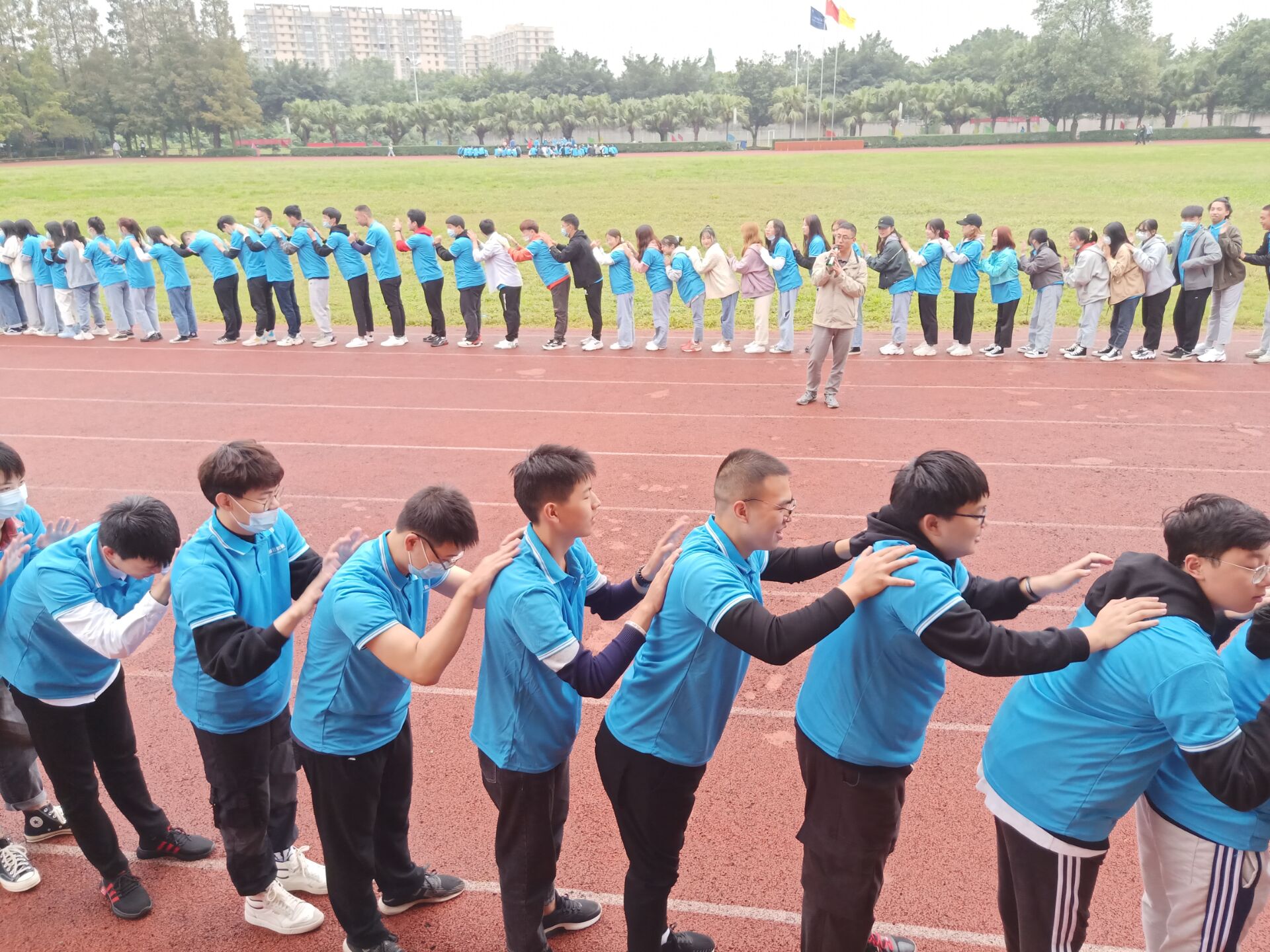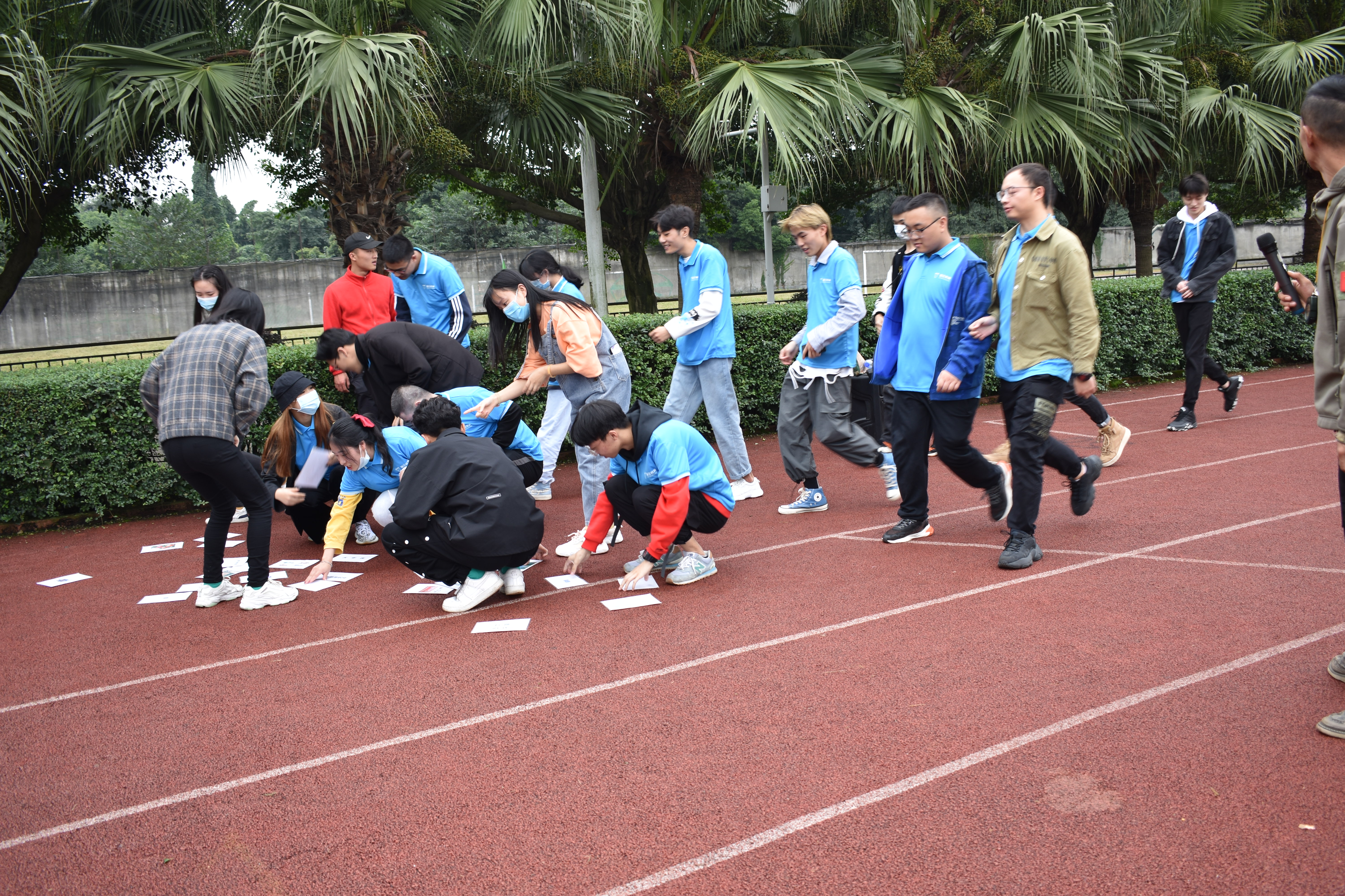活动伊始,尽管天公不作美,但仍旧无法阻挡我系20级新生的热情。活动主教练以“雨”为灵感,组织同学们进行“雨势拍拍”的热身小游戏,打破了初识的尴尬。紧接着,在各区域主教练的号召下,同学们依次组建了各自的团队,认真聆听教练讲解活动细则,并在教练的带领下有序开展了“抱抱团”、“踩纸条”、“扑克牌”等一系列游戏,每位同学都积极参与、热情高涨,整个操场上欢笑阵阵。