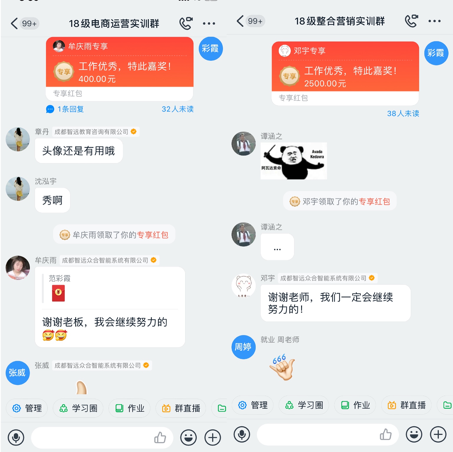 当日下午,各专业方向实训结业典礼在各班主任老师的主持下有序进行,线上实训参训成员全员参与,各专业方向实训指导老师、各答辩场评委老师代表进行总结。最终,班主任老师公布表彰在实训过程中脱颖而出的9支“优秀团队”和5位“优秀个人”,共计发放企业奖金6700元。其中整合营销实训方向因为是对接的真实生产性实训项目,团队奖金高达2500元!