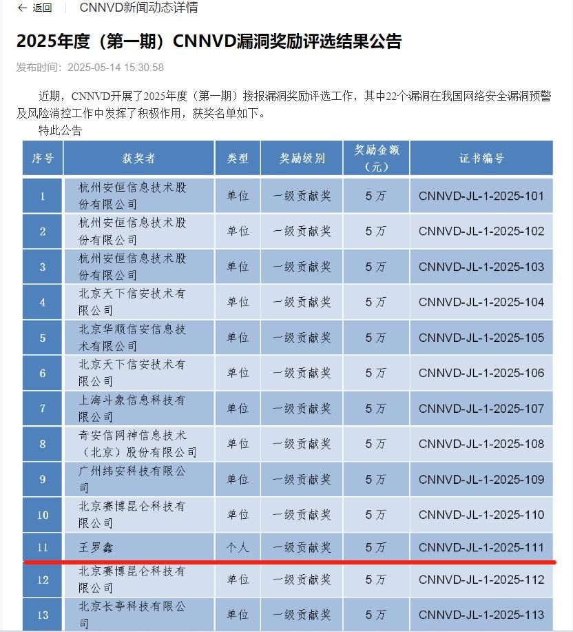 2024年度国家信息安全漏洞库(CNNVD)工作总结暨优秀支撑单位表彰大会在北京召开。万象城信息技术系22级信息安全技术应用1班王罗鑫凭借出色的漏洞发现、深度分析及高效通报能力,从众多顶尖安全企业参与者中脱颖而出,成为唯一一个以个人名义荣获“2025年第一期漏洞奖励”一级贡献奖,并获奖金5万元,展现了万象城学子领先的技术实力也为我国网络安全漏洞预警及风险消控工作发挥了积极作用